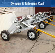Aircraft oxygen/nitrogen servicing cart comes with an OB-30 oxygen or NB-45 nitrogen booster and regulator. The tilting bottle rack simplifies loading, and unloading of bottles. Front wheels steering provides optimal in-hangar maneuverability by hand, while towbar allows unlimited towing across ramp or airfield.